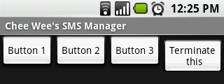 LinearLayout LLinearLayout = new LinearLayout(this); Button[] LButtons = new Button[4]; for (int i=0; i<3; i++) { Button LButton = new Button(this); LButton.setText("Button "+(i+1)); LButtons[ i ] = LButton; LLinearLayout.addView(LButton); } Button LButton = new Button(this); LButton.setText("Terminate this"); LButtons[3] = LButton;